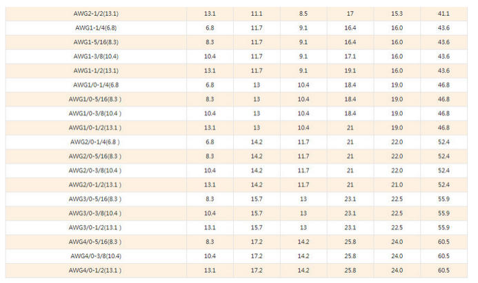 AWG3/0*1/2, AWG4/0*1/4, AWG4/0*5/16, AWG4/0*3/8, AWG4/0*1/2